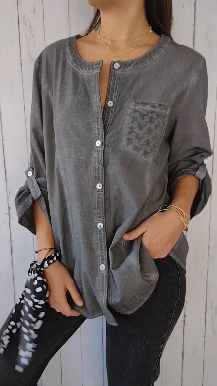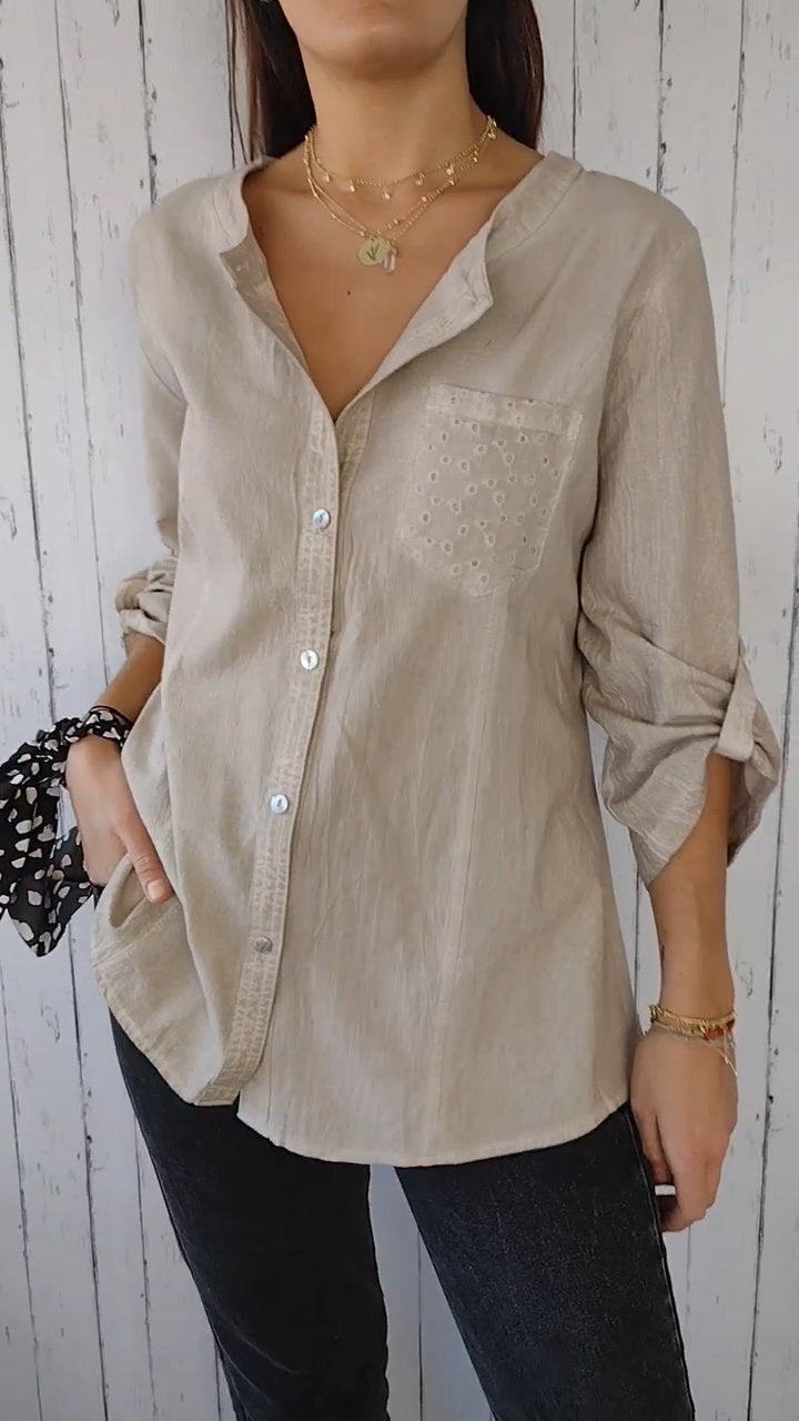 Feminine Details Die Bluse besticht durch ihre schlichte, aber raffinierte Optik. Die aufgesetzte Brusttasche mit zarten Stickereien setzt einen eleganten Akzent, während die Knopfleiste und der klassische Kragen für einen zeitlosen Look sorgen. Die Ärmel können hochgekrempelt und fixiert werden, um einen lässigeren Stil zu erzielen, perfekt für warme Tage oder einen entspannten Look.