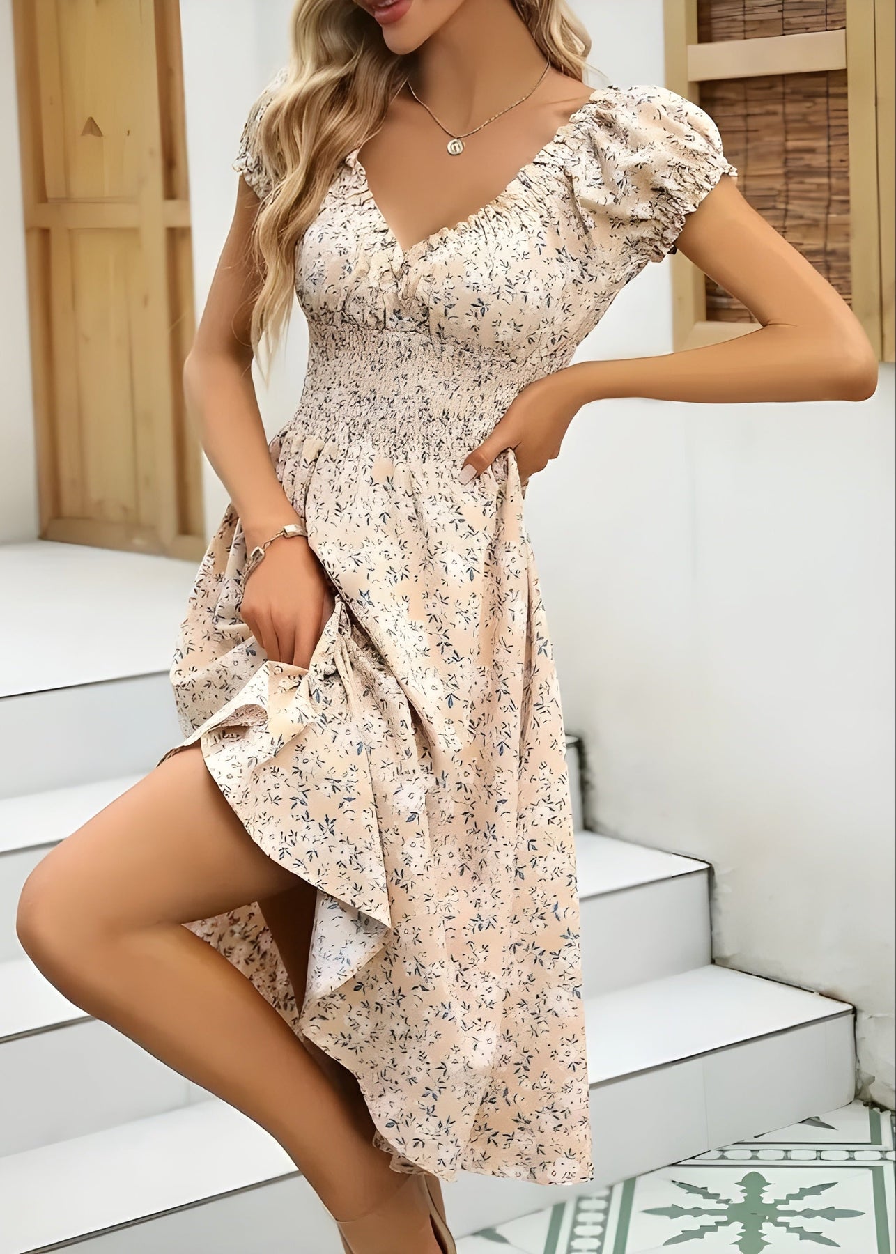 Aurore verkörpert Sanftheit und Weiblichkeit. Mit ihrem zarten Blumenmuster, dem V-Ausschnitt und den Puffärmeln verleiht dieses Kleid Ihnen eine elegante, schmeichelhafte Silhouette. Perfekt für sonnige Tage oder einen Sommerausflug, begleitet Aurore Sie mit Anmut und Komfort durch jeden Moment.