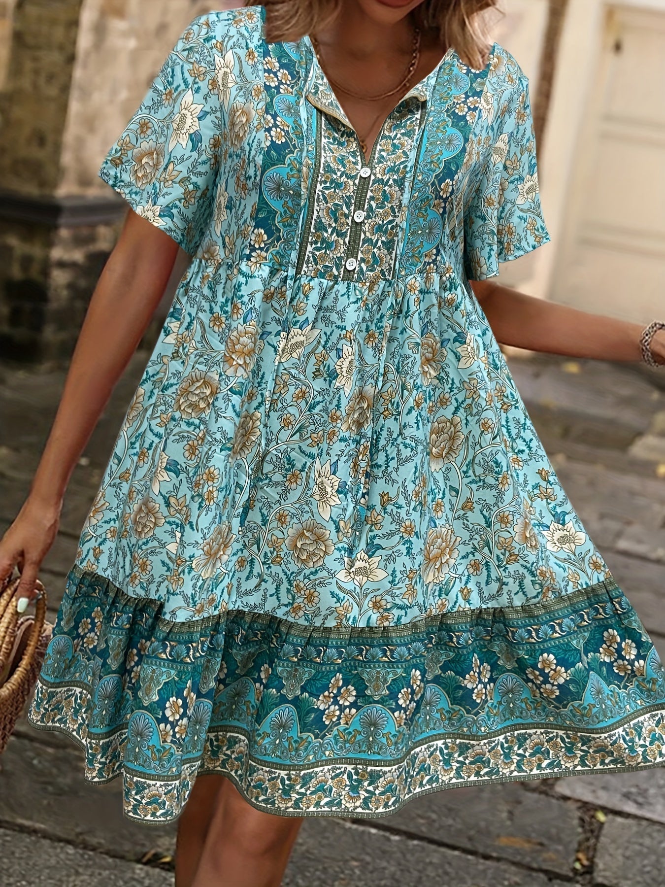 Boho-Chic für deinen Sommer: Unser rosa Blumenmuster-Kleid im Boho-Stil ist die perfekte Wahl für einen entspannten Sommerlook. Mit seinen lebhaften Farben und dem verspielten, floralen Muster bringt dieses Kleid eine fröhliche Note in deine Garderobe. Der lockere Schnitt und die luftigen kurzen Ärmel machen es ideal für warme Frühlingstage und heiße Sommertage, während die feinen Details für einen Hauch von Eleganz sorgen.