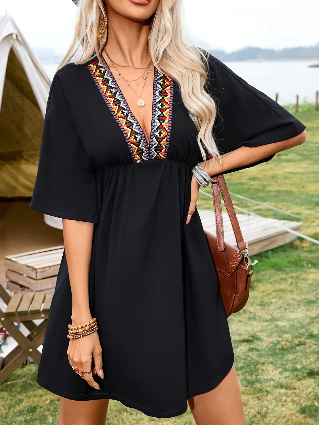 Tauchen Sie ein in den lässigen Boho-Stil mit diesem eleganten schwarzen Mini-Kleid, das durch seinen auffälligen, farbenfrohen tiefen Ausschnitt besticht. Perfekt für Frühlings- und Sommertage, bringt dieses Kleid mühelos Stil und Komfort zusammen.